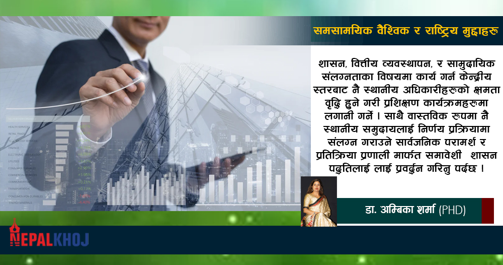 शासन, वित्तीय व्यवस्थापन, र सामुदायिक संलग्नताका विषयमा कार्य गर्न केन्द्रीय स्तरबाट नै स्थानीय अधिकारीहरूको क्षमता वृद्धि हुने गरी प्रशिक्षण कार्यक्रमहरूमा लगानी गर्ने । साथै वास्तविक रूपमा नै स्थानीय समुदायलाई निर्णय प्रक्रियामा संलग्न गराउने सार्वजनिक परामर्श र प्रतिक्रिया प्रणाली मार्फत समावेशी शासन पद्धतिलाई लाई प्रवर्द्धन गरिनु पर्दछ।