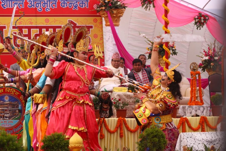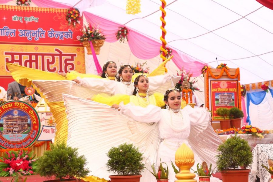 ब्रम्हाकुमारी ईश्वरीय विश्वविद्यालय एवं राजयोग प्रशिक्षण केन्द्रद्वारा शनिबार पोखरा महानगरपालिका– ११ फुलबारीमा निर्माणाधीन शान्ति अनुभूति केन्द्रको भवन शिलान्यास कार्यक्रममा नृत्य प्रस्तुत गर्दै ब्रह्माकुमारी बहिनीहरु ।