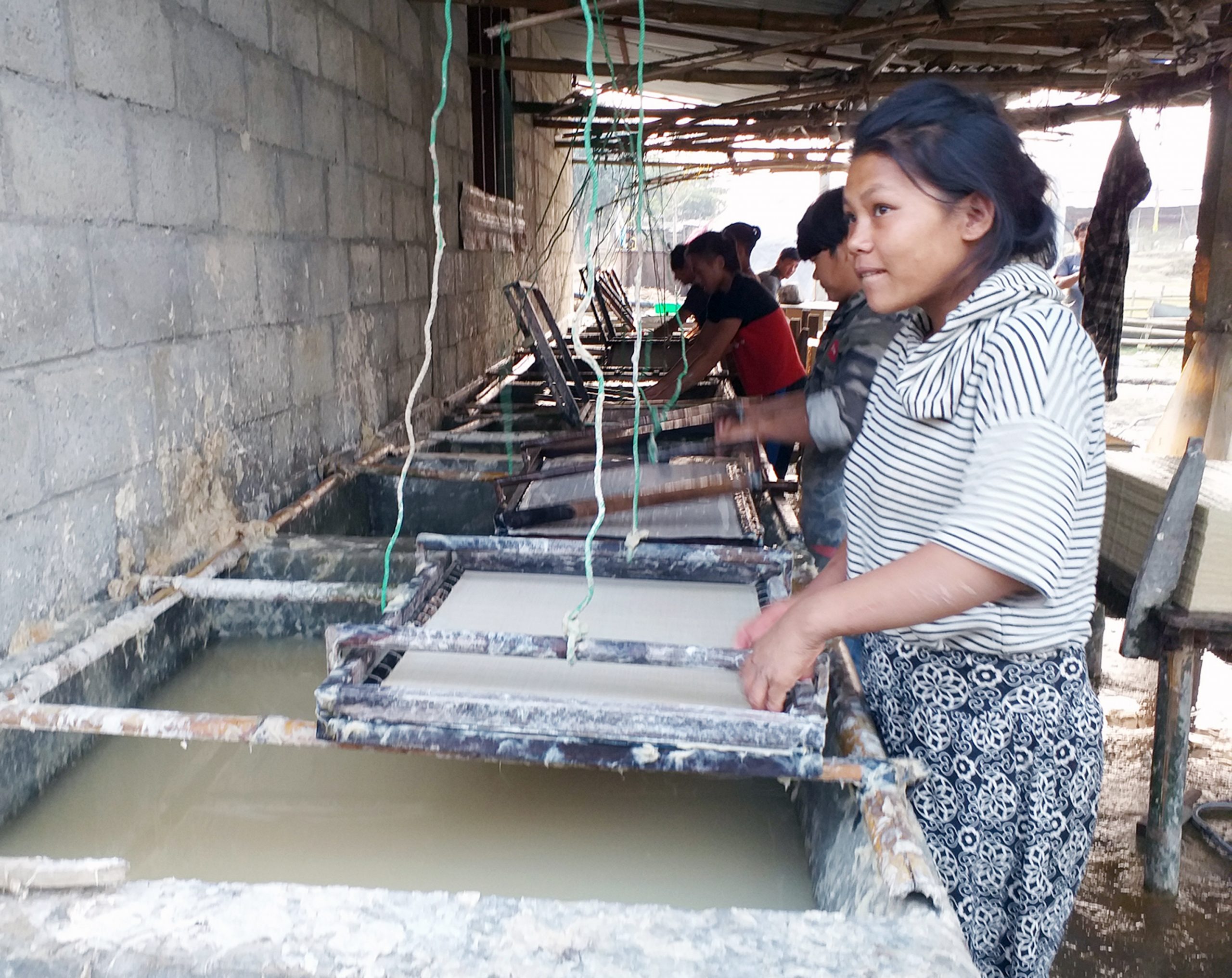 झापा बिर्तामोड–१० की दिलु राई र कुमार राईले सञ्चालन गरेको ‘कुमानोइल नेपाली हाते काजग उद्योगमा काम गर्दै कामदार ।