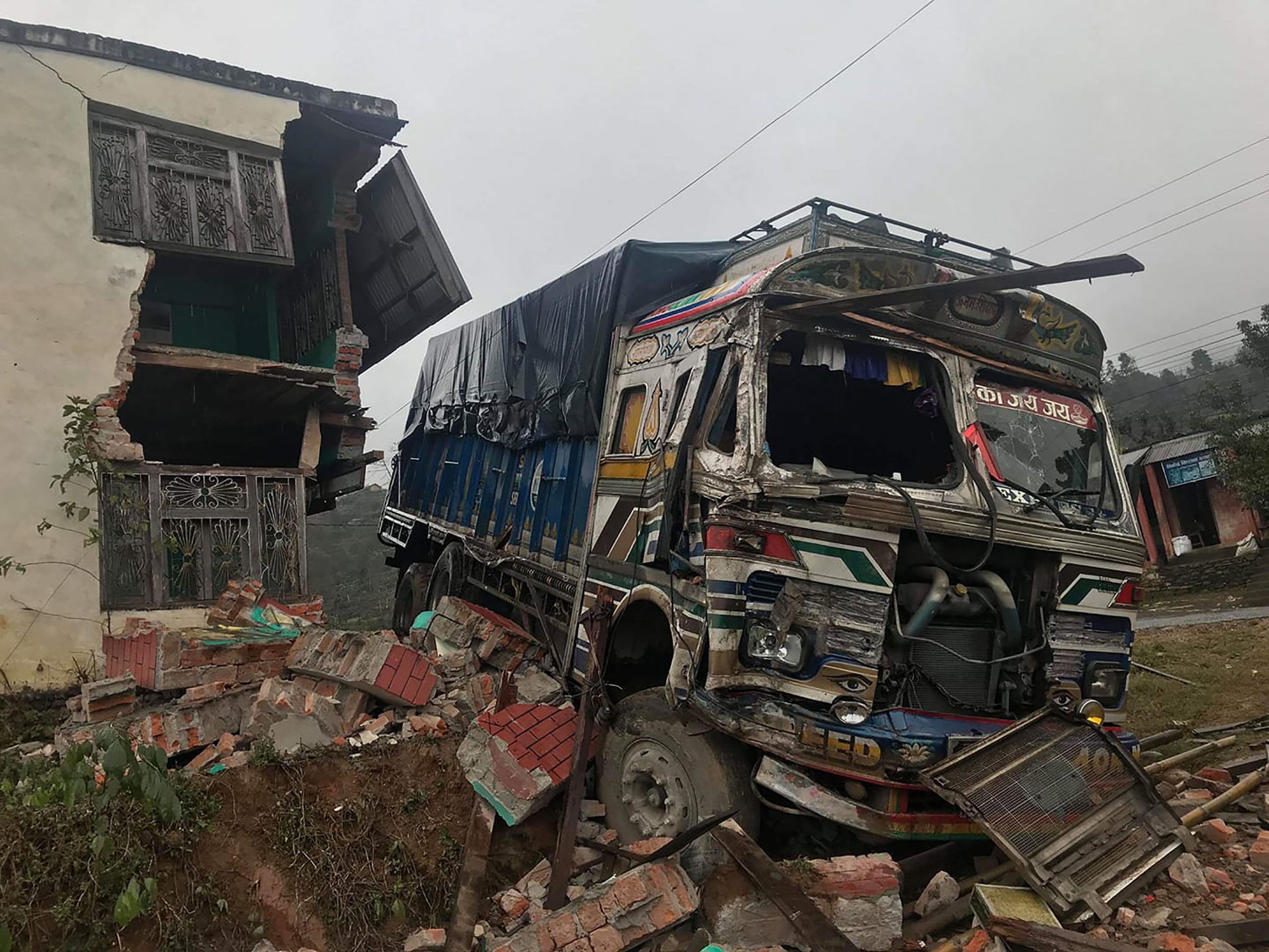 तनहुँको व्यास नगरपालिका–१२ कमलाबारीमा बुधबार बिहान भएको दुर्घटनामा क्षतिग्रस्त घर र ट्रक । आँबुखैरेनीबाट आउँदै गरेको ट्रक घरमा ठोक्किँदा घरमा क्षति पुगेको छ । घरमा कोही पनि नभएकोले मानवीय क्षति भने भएको छैन ।