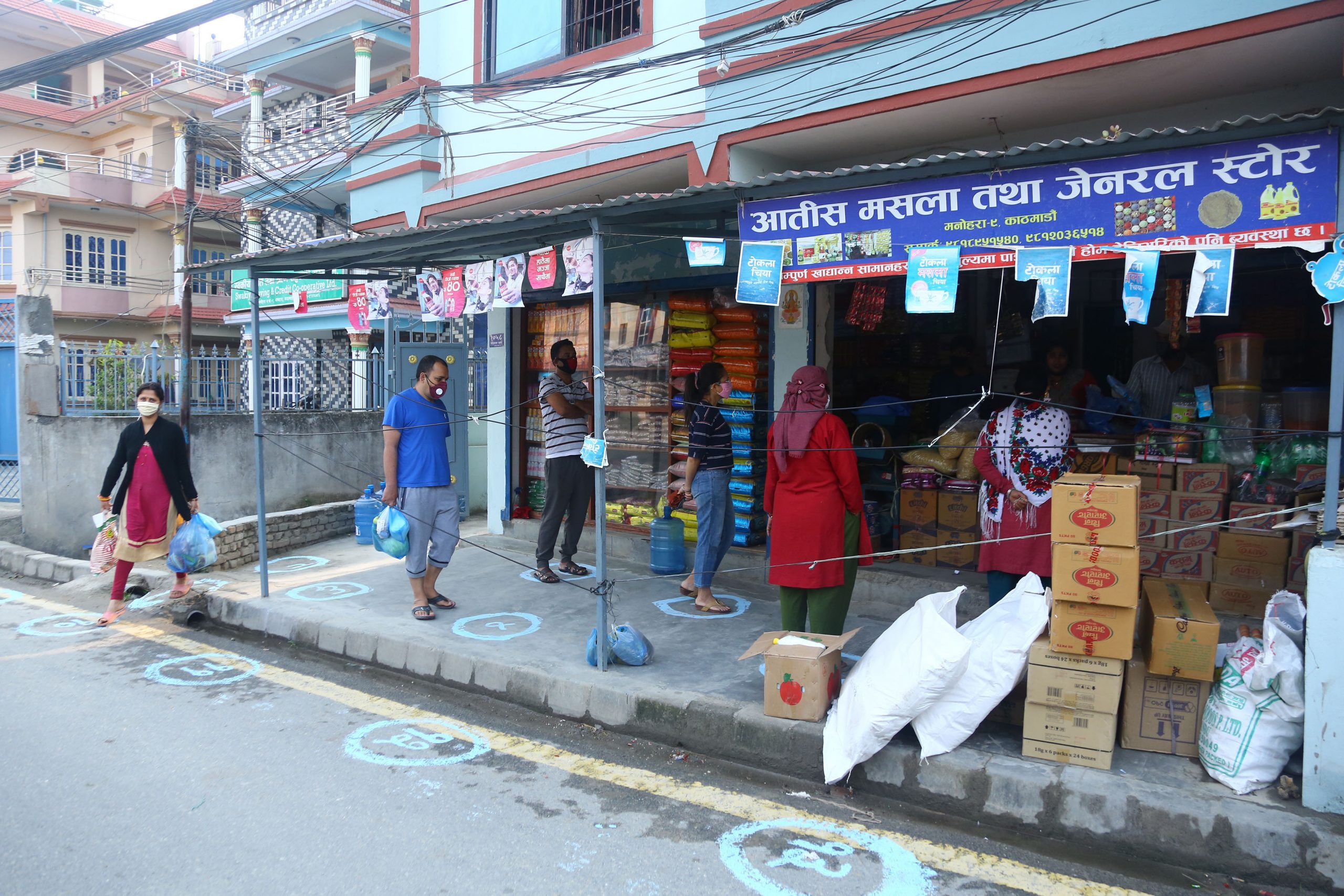 लकडाउनको अवधिमा काठमाडौँको कागेश्वरी मनोहरा नगरपालिका–९ को एक पसलमा सामाजिक दूरी कायम गरी उपभोग्य वस्तु खरिद गर्दै स्थानीय ।