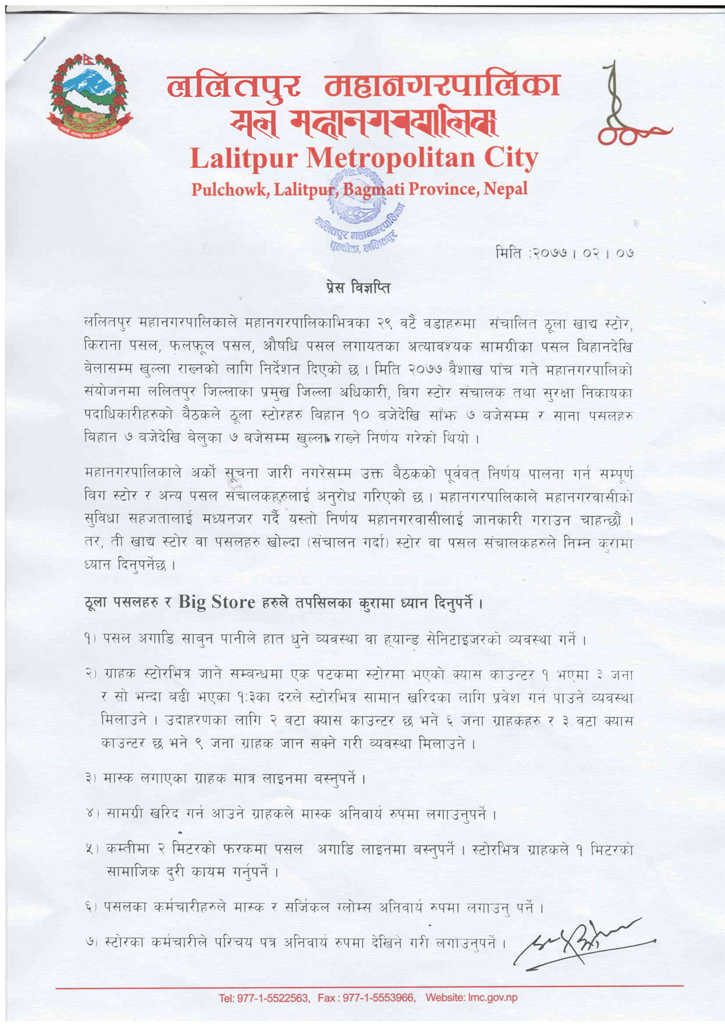 पसलमा सुरक्षाका उपाय भने अपनाउनु पर्नेछ। पसल अगाडि साबुन पानी वा स्यानिटाइजरको अनिवार्य व्यवस्था गर्न पनि महानगरपालिकाले निर्देशन दिएको छ।