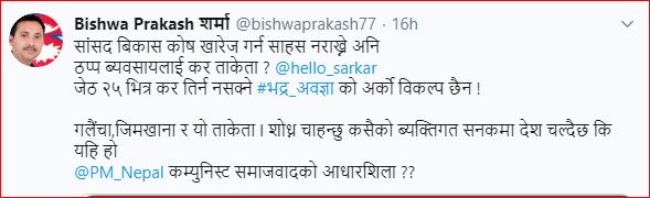 कांग्रेस प्रवक्ता विश्वप्रकाश शर्माले ट्वीटरमार्फत कर बुझाउन जारी भएको निर्देशनको अवज्ञा गर्न आह्वान गरेका हुन् । शर्माले ट्वीटमा लेखेका छन्, ‘सांसद विकास कोष खारेज गर्न साहस नराख्ने, अनि ठप्प व्यवसायलाई कर ताकेता ? जेठ २५ भित्र कर तिर्न नसक्ने भद्र अवज्ञाको अर्को विकल्प छैन ।’