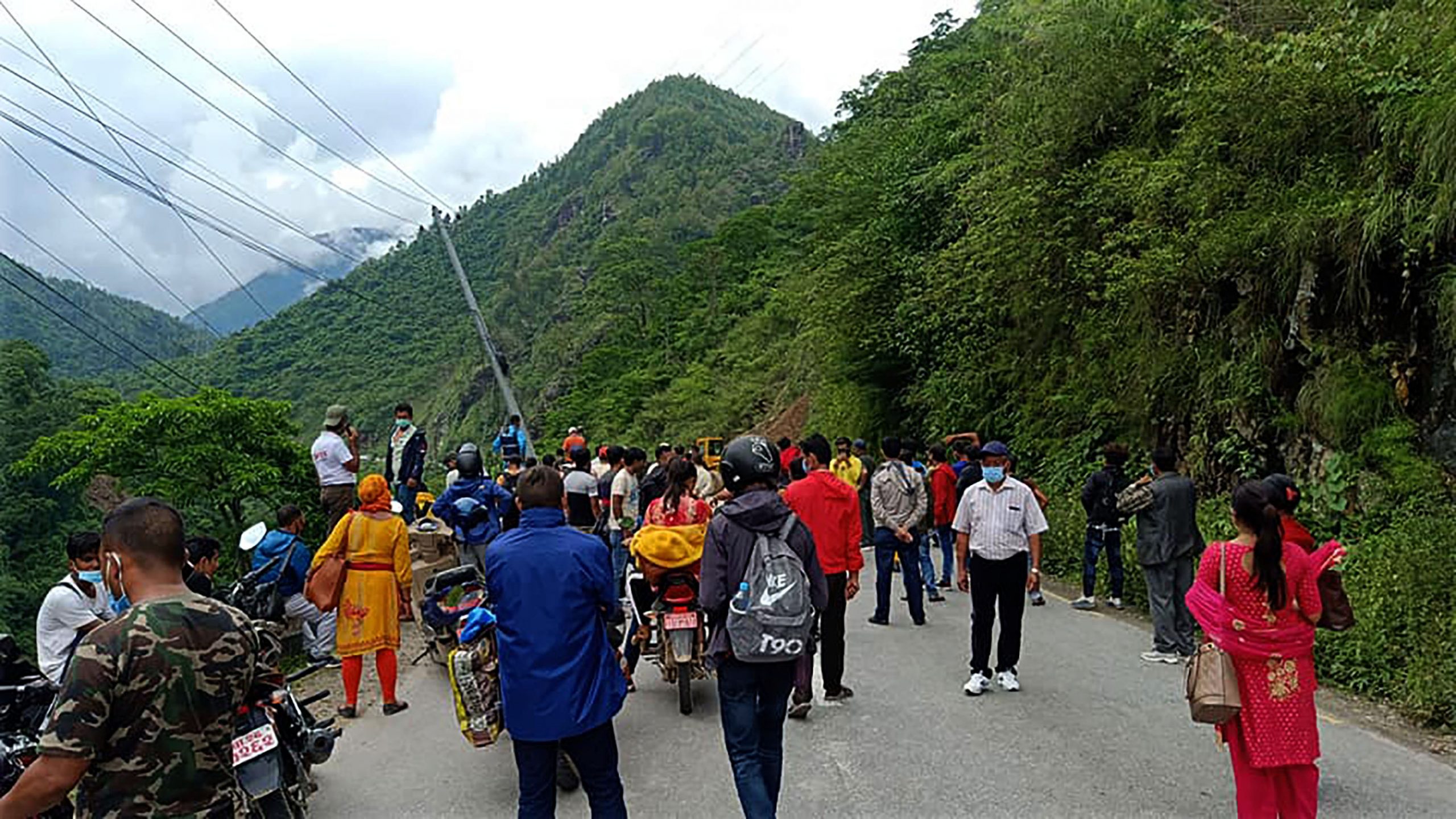 तनहुँको आँबुखैरेनी गाउँपालिका–४ स्थित पृथ्वीराजमार्गमा मङ्गलबार बिहान पहिरो खसेर राजमार्ग अवरुद्ध भएपछि जाममा रोकिएका सर्वसाधारण ।