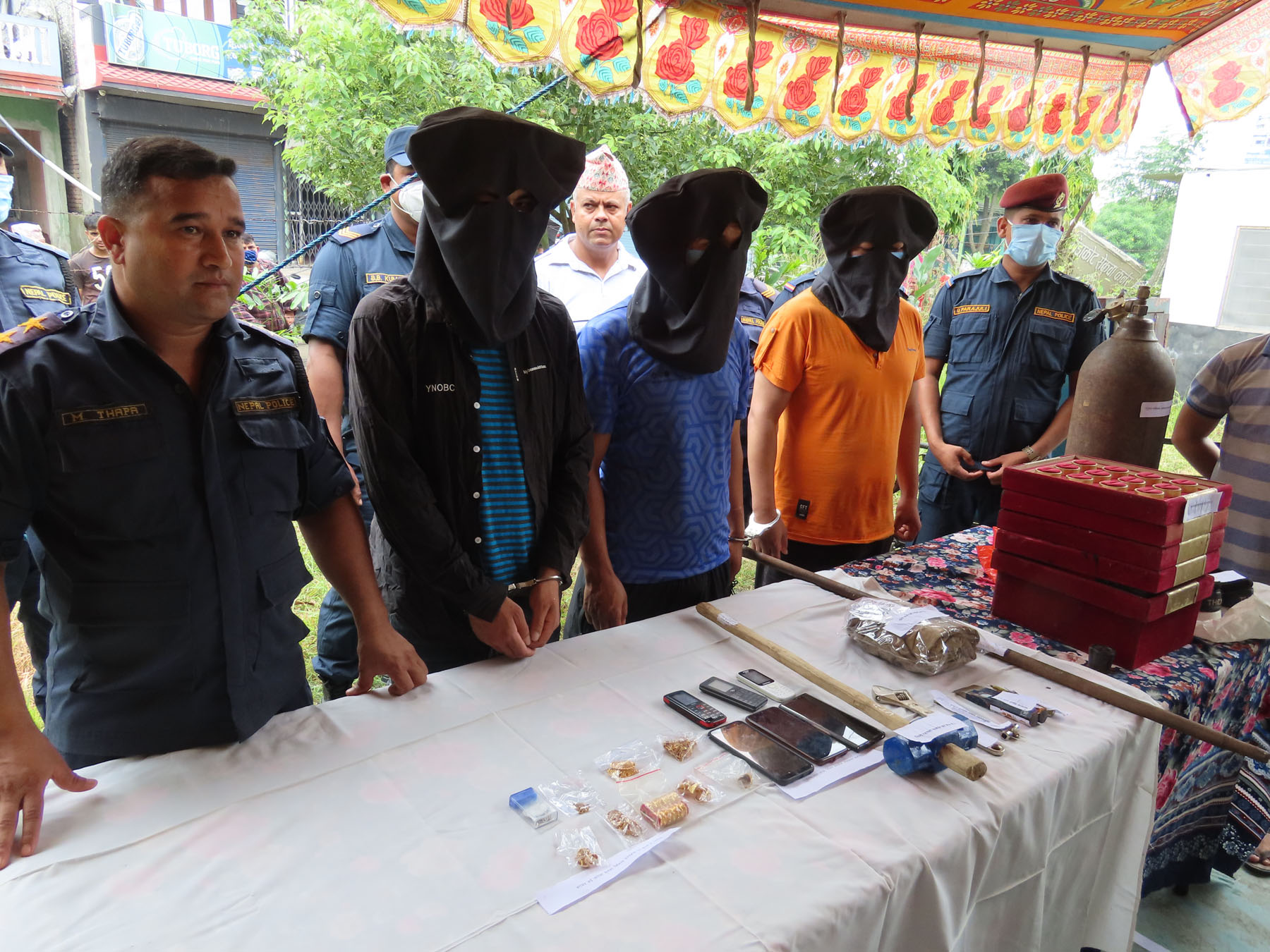 नवलपरासी पूर्व गैडाकोटमा रहेको मोनिका सुनचाँदी पसल चोरी गर्ने तीन जनालाई पक्रउ गरी सार्वजनिक गर्दै प्रहरी । अभियुक्तहरुकोे साथबाट १२ तोला ५ प्वाइन्ट सुन, ६ थान मोबाइल, सेफ लकर १ थान, स्कुटर १ थान र ठेला बरामद गरिएको छ ।