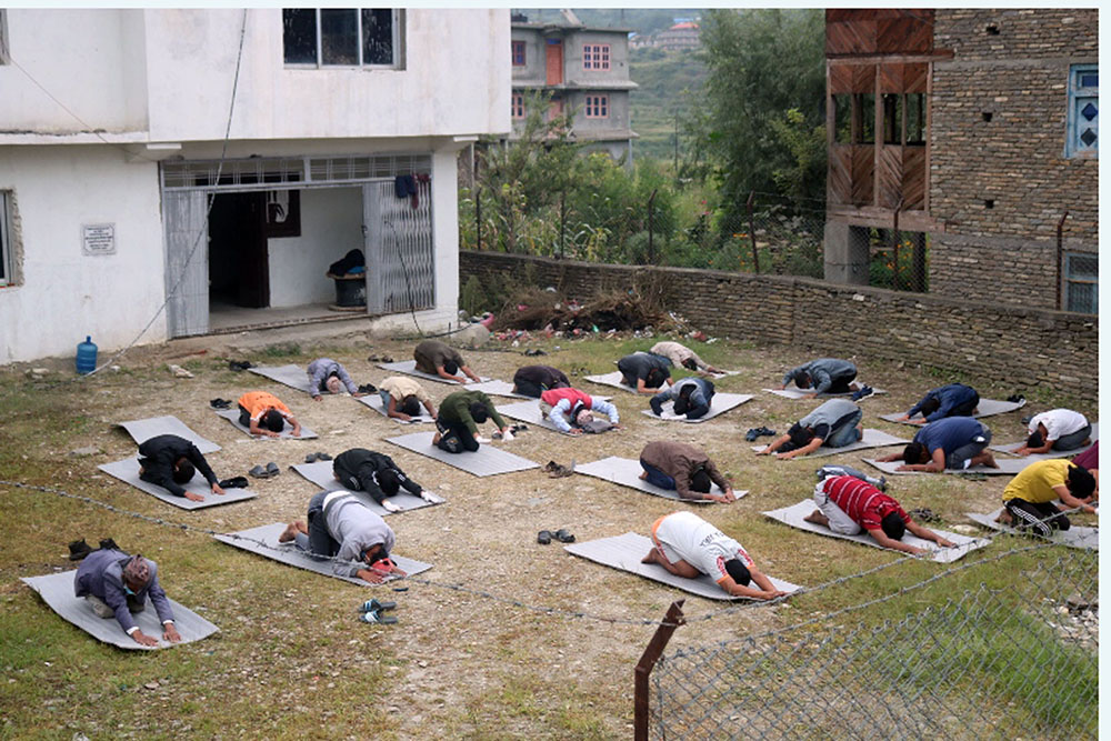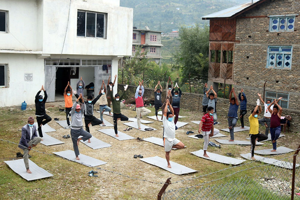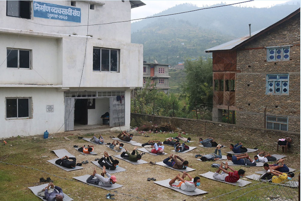 चन्दननाथ नगरपालिका जुम्ला खलङ्गा नजिकै निर्माण व्यवसायी सङ्घको भवनमा रहेको आइसोलेशन सेन्टरमा कोरोना सङ्क्रमित योग अभ्यास गर्दै । सो आइसोलेशन सेन्टरमा २७ जना कोरोना सङ्क्रमित छन् ।