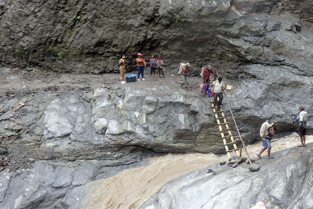 मनाङ । बेंसीशहर ९ चामे सडकखण्डअन्तर्गत मस्र्याङ्दी गाउँपालिका –४ मा घोप्टेखोलाले सडक बगाएको महिनौं दिन बित्दासमेत सडक चल्न नसकेपछि बाँसको भर्याङ्गबाटै जोखिम मोलेर मजदुरको सहयोगमा खाद्यान्नलगायत अन्य सामग्री ढुवानी गर्न बाध्य स्थानीयवासी ।