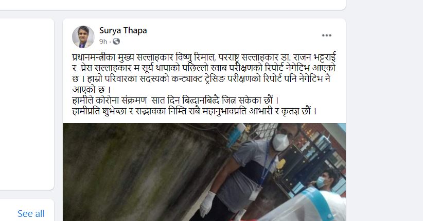 सल्लाहकार थापाकाअनुसार उनिहरुका परिवारका सदस्यको कन्ट्याक्ट ट्रेसिङ परीक्षणको रिपोर्ट पनि नेगेटिभ आएको छ ।