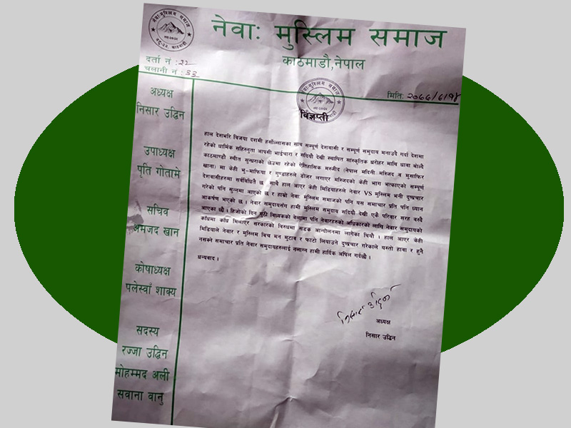 समाजका अध्यक्ष निसार उद्दिनले हस्ताक्षर गरी जारी गरेको बिग्यप्तीमा भनिएको छ-हाल देशभरी बिजया दशमी हर्सोउल्लासका साथ सम्पुर्ण देशबासी र सम्पूर्ण समुदायले मनाउदै गर्दा देशमा रहेका धार्मिक सहिस्ष्णुता आपसी भाइचारा र सदियो देखि स्थापित सासकृतिक धरोहर माथि धावा बोल्दै काठमाडौस्थित सुन्धाराको छेउमा रहेको ऐतिहासिक मस्जिद (नेपाल मदिनि मस्जिद व मुसाफिर खाना)मा केही भु माफिया र गुन्डा हरुले डोजर लगाएर मस्जिदको केही भाग भत्काएको सबैमा बिदितै छ। विग्यप्तिमा भनिएको छ यसैलाई आधार बनाएर केही अनर्गल प्रचारबाजी प्रति हामी आपत्ति प्रकट गर्दछौ ।