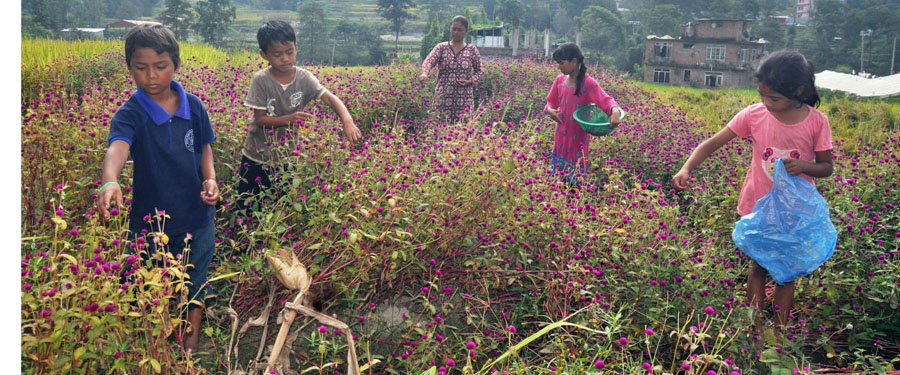 भक्तपुर । तिहार पर्व नजिकिएसँगै भक्तपुरको सूर्यविनायक नगरपालिका–७, गुण्डुमा ढकमक्क फूलेको मखमली फूल टिप्दै किसान परिवार ।