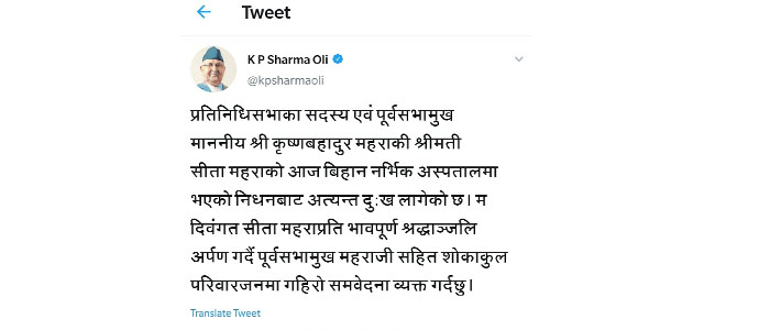 काठमाडाैं । प्रधानमन्त्री केपी शर्मा ओलीले पूर्वसभामुख कृष्णबहादुर महराकी श्रीमती सीताको आज बिहान नर्भिक अस्पतालमा भएको निधनबाट आफूलाई अत्यन्त दुःख लागेको बताएका छन् ।