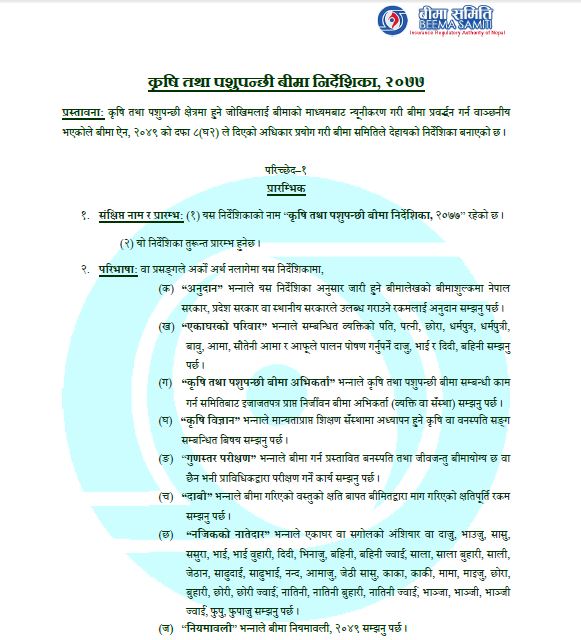 बाली तथा पशुन्छी बीमा निर्देशिका २०६९ लाई परिमार्जन गरी कृषि तथा पशुपन्छी बीमा निर्देशिका २०७७ जारी गरिएको हो । कृषि तथा पशुपन्छी क्षेत्रमा हुने जोखिमलाई बीमाको माध्यमबाट न्युनीकरण गरी बीमा प्रवर्धन गर्न वान्छनीय भएकोले बीमा ऐन २०४९ को दफा ८ (घ२) ले दिएको अधिकार प्रयोग गरी परिमार्जित निर्देशिका जारी गरिएको समितीले जानाएको छ । निर्देशिका अनुसार बीमाको क्षेत्र बनस्पती बीमा र जीवजन्तु बीमा रहेको छ ।