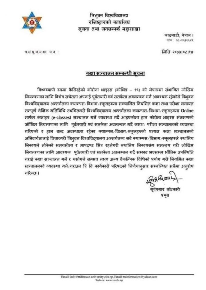 कोरोनाभाइरस (कोभिड( १९) को जोखिम नियन्त्रण गर्न आवश्यक पूर्वतयारी गरी सम्भव भएसम्म भौतिक उपस्थितिमै कक्षा सञ्चालन गर्न त्रिविले अपिल गरेको हो । सम्भव नभएको खण्डमा अन्य वैकल्पिक विधि अपनाउन सक्ने विकल्प पनि त्रिविले दिएको छ ।