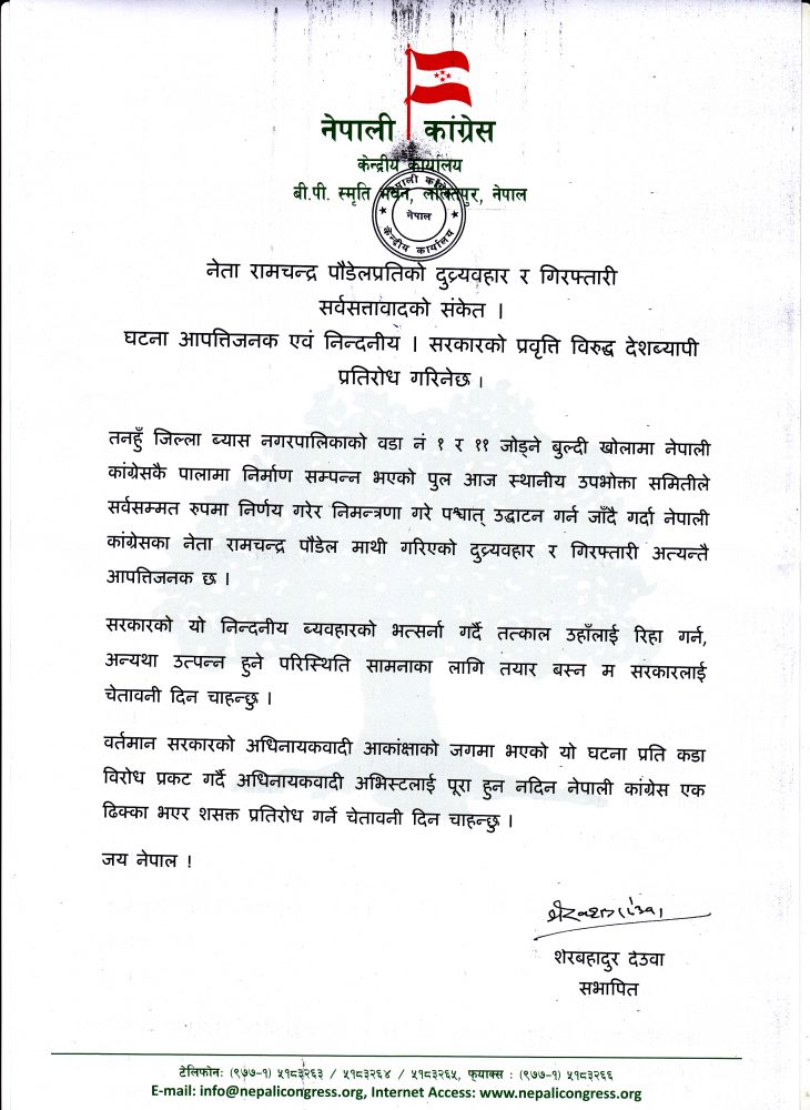 आज एक विज्ञप्ति जारी गर्दै सभापति देउवाले वर्तमान सरकारको अधिनायकवादी आकाङ्क्षाको जगमा भएको यो घटनाप्रति कडा विरोध प्रकट गर्दै अधिनायकवादी अभीष्टलाई पूरा हुन नदिन कांग्रेसले एक ढिक्का भएर सशक्त प्रतिरोध गर्ने चेतावनी दिएका छन् ।