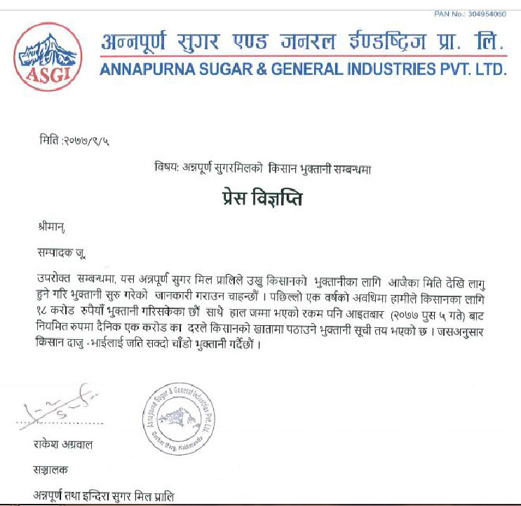 काठमाडौं । अन्नपूर्ण सुगर एण्ड जनरल इन्डष्ट्रिज प्रालीले आज आईतबारबाट उखुु किसानहरुको बक्यौता रकम दिने भएको छ । कम्पनीले आज बिज्ञप्ती जारी गर्दे नियमितरुपमा दैनिक १ करोड रुपैयाँको दरमा किसानहरुको खातामा रकम पठाउने भुक्तानी सुची तयार गरेको जानकारी दिएको छ ।