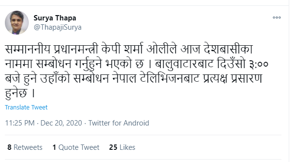 प्रधानमन्त्रीको सम्बोधन नेपाल टेलिभिजनबाट प्रत्यक्ष प्रसारण हुनेछ ।