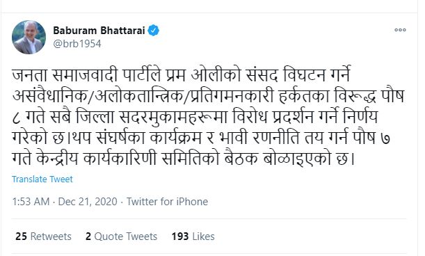 उनले भने, ‘प्रधानमन्त्री ओलीको संसद विघटन गर्ने असंवैधानिकरअलोकतान्त्रिकरप्रतिगमनकारी हर्कतका विरूद्ध पौष ८ गते सबै जिल्ला सदरमुकामहरूमा विरोध प्रदर्शन गर्ने निर्णय गरेको छ।’