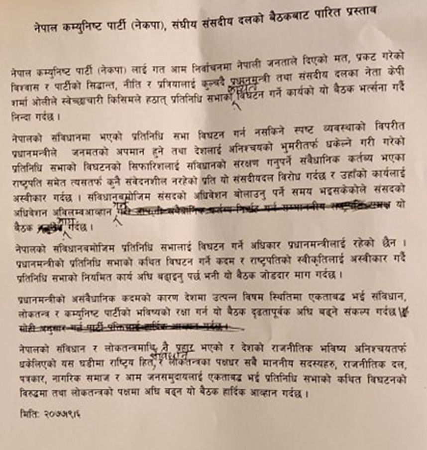 ‘नेपाल कम्युनिष्ट पार्टी (नेकपा) लाई गत आम निर्वाचनमा नेपाली जनताले दिएको मत, प्रकट गरेको विश्वास र पार्टीको सिद्धान्त, नीति र प्रत्रियालाई कुल्चदै प्रधानमन्त्री तथा संसदीय दलका नेता केपी शर्मा ओलीले स्वेच्छाचारी किसिमले हठात् प्रतिनिधि सभाको विघटन गर्ने कार्यको यो बैठक भर्त्सना गर्दै निन्दा गर्दछ।’ बैठकपछि जारी विज्ञप्तिमा भनिएको छ, ‘नेपालको संविधानमा भएको प्रतिनिधि सभा विघटन गर्न नसकिने स्पष्ट व्यवस्थाको विपरीत प्रधानमन्त्रीले जनमतको अपमान हुने तथा देशलाई अनिश्चयको भूमरीतर्फ धकेल्ने गरी गरेको प्रतिनिधि सभाको विघटनको सिफारिशलाई संविधानको संरक्षण गनुपर्ने संवैधानिक कर्तब्य भएका राष्ट्रपति समेत त्यसतर्फ कुनै संवेदनशील नरहेको प्रति यो संसदीयदल विरोध गर्दछ र उहाँको कार्यलाई अस्वीकार गर्दछ । ’