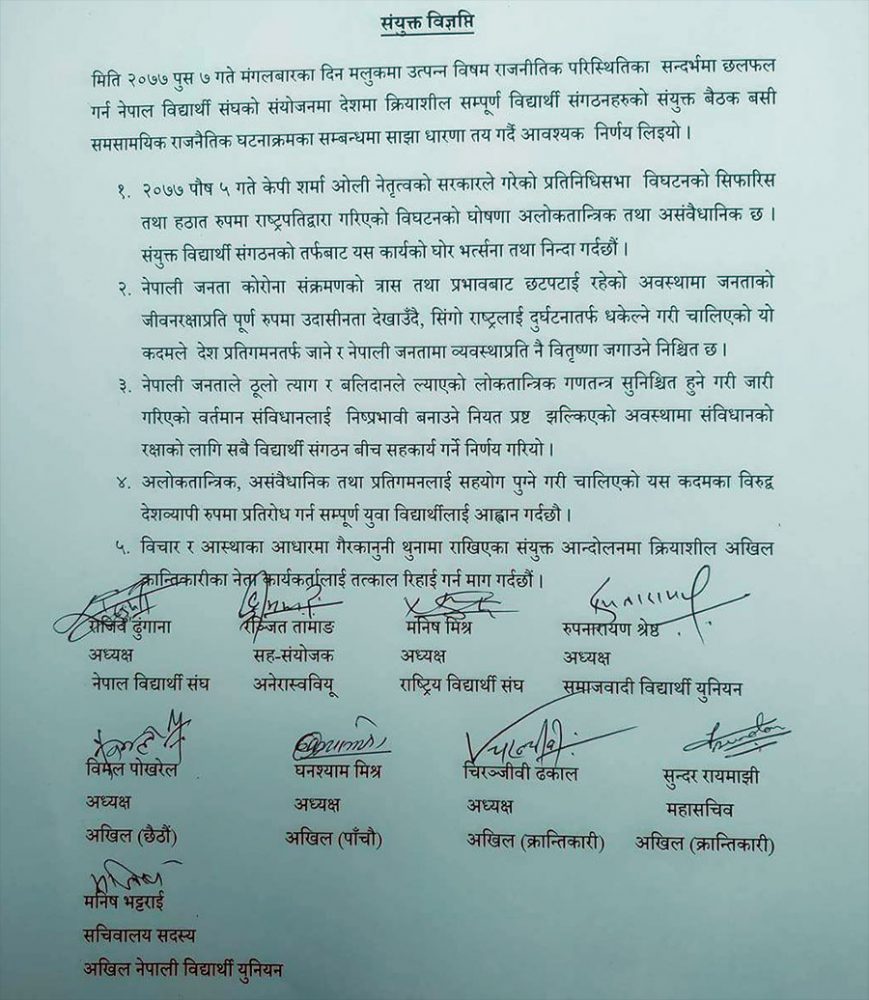 काठमाडौं । नौ विद्यार्थी संगठनहरुले संसद विघटन असंवैधानिक र अलोकतान्त्रिक भएको भन्दै विरोध जनाएका छन् ।
