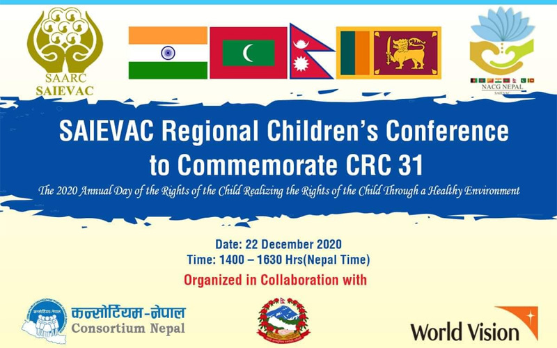 काठमाडौ । बाल अधिकार सम्वन्धी महासन्धि पारित भएको ३१ वर्ष पूरा भएको अवसरमा साइभाक, राष्ट्रिय कार्य कार्यन्वयन समुह (एनएसीजी) नेपाल तथा कन्सोर्टियम नेपालको संयुक्त आयोजनामा दक्षिण एशिया स्तरीय बालसहभागिता सम्वन्धी सम्मेलन आज सम्पन्न भएको छ ।