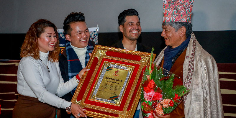 काठमाडौं । चर्चित ‘फूल बुट्टे सारी’ गीतले युट्युबमा करोडबढी भ्यूज पाएको अवसरमा बुधबार अग्रज कलाकारहरुलाई सम्मान गरिएको छ । काठमाडौंको राइजिङ मलस्थित क्युज सिनेमा हलमा बुधबार आयोजित विशेष समारोहमा वरिष्ठ हास्य कलाकार मदनकृष्ण श्रेष्ठ र गीतकार राजुबाबु श्रेष्ठलाई सम्मान गरिएको हो ।