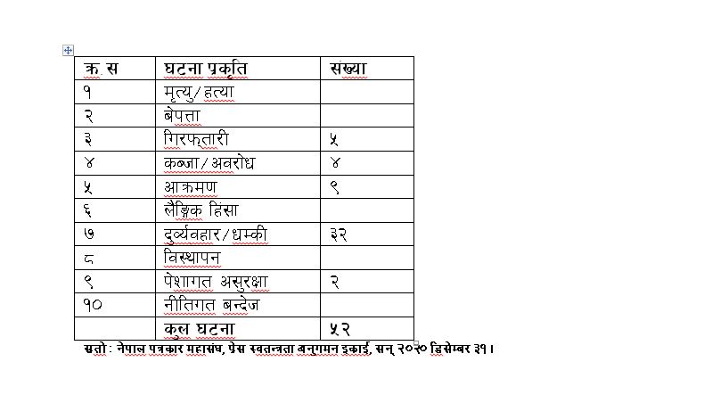 नेपाल पत्रकार महासंघको प्रेस स्वतन्त्रता अनुगमन इकाइमा गरिएको अभिलेख अनुसार सन् २०२० जानवरी १ देखि २०२० डिसेम्वर ३१ सम्मको यो एक बर्षको अवधिमा ५२ वटा प्रेस स्वतन्त्रता हननका घटनाहरु अभिलेख गरिएको छ । गत बर्ष अर्थात सन् २०१९ मा प्रेस स्वतन्त्रता हननका ५० वटा घटना अभिलेख गरिएको थियो ।
