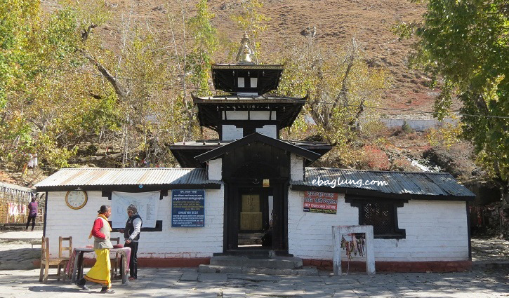 विष्णु, लक्ष्मीनारायण, भूदेवीका मूर्ति रहेको यो मन्दिर हिन्दू र बौद्धमार्गीको साझा तीर्थस्थलका रुपमा रहेको छ । मुक्तिनाथ र गुम्बामा हिन्दूका ब्राह्मण पुजारी र बौद्धका झुमाले आआफ्नै परम्पराअनुसार पूजा तथा रेखदेख गर्ने प्रचलन छ । मुस्ताङको सदरमुकाम जोमसोमबाट पूर्वमा पर्ने यो मन्दिर तीन हजार ७१० मिटर उचाइमा छ । यहाँबाट धवलागिरि, निलगिरि, गणेश, थोरङ्लालगायत उच्च हिमाली शृङ्खला एकसाथ अवलोकन गर्न सकिन्छ ।