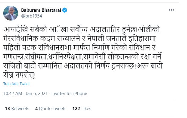 बुधबार ट्वीटरमार्फत अध्यक्ष भट्टराईले आजबाट सबैको ध्यान सर्वोच्च अदालततिर हुने भन्दै संसद विघटनको मुद्दा सच्याउने आशा व्यक्त गरेका छन् । उनले लोकतन्त्रको रक्षा गर्ने सजिलो बाटो अदालतको निर्णय हुनसक्ने आँकलन गरेका छन् । त्यस्तै उनले सर्वोच्चबाट उल्टो निर्णय भए अरू बाटो रोज्ने चेतावनी समेत दिएका छन् ।