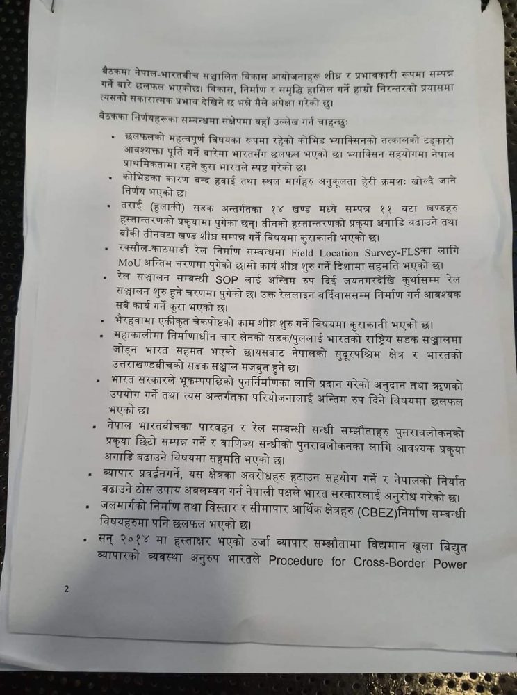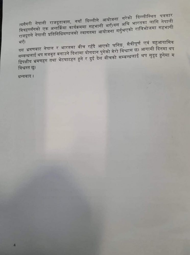 ‘‘भारत भ्रमणले घनिष्ठ, मैत्रीपूर्ण एवं बहुआयामिक सम्बन्धलाई थप मजबुत बनाउने दिशामा योगदान पुगेको विश्वास छ,’’ उनले भने, ‘‘थप द्विपक्षीय भ्रमण हुने र सम्बन्ध मजबुत हुने विश्वास छ ।’’