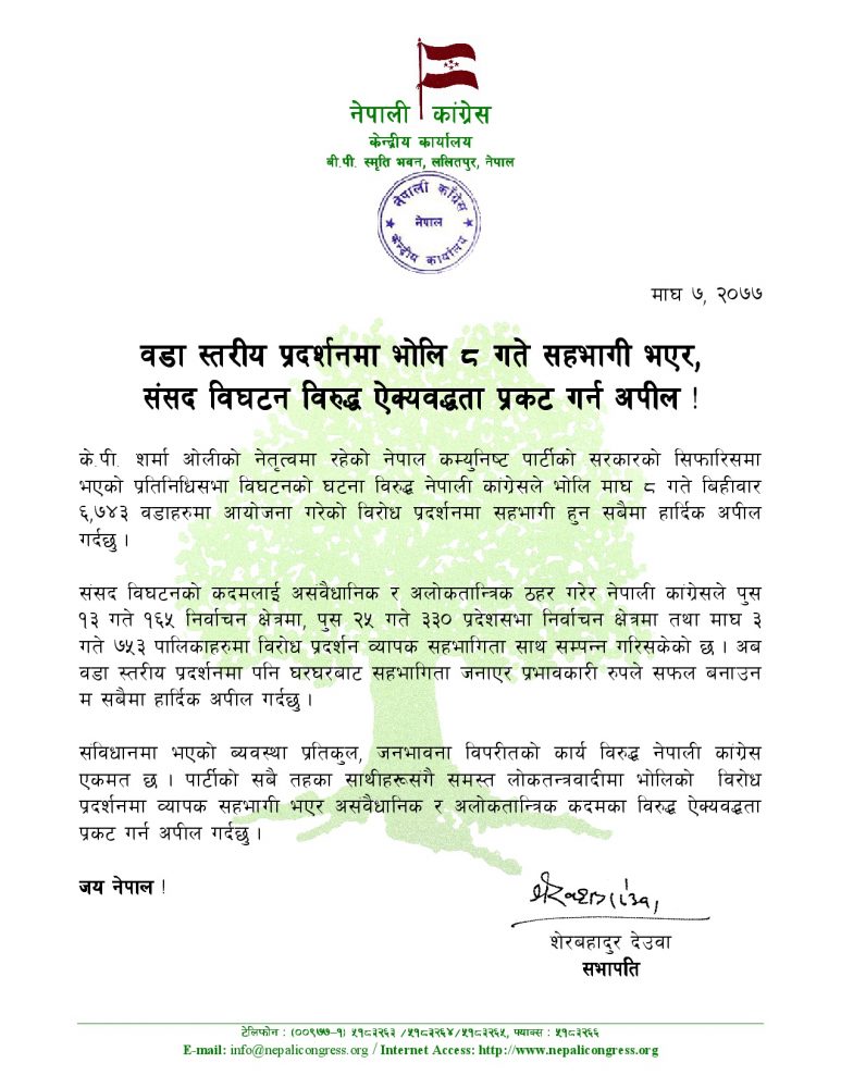 ‘संविधानमा भएको व्यवस्था प्रतिकूल, जनभावना विपरीतको कार्यविरुद्ध नेपाली कांग्रेस एक मत छ’, विज्ञप्तिमा भनिएको छ, ‘पार्टीका सवै तहका साथीहरुसँगै समस्त लोकतन्त्रवादीमा भोलिको विरोध प्रदर्शनमा व्यापक सहभागी भएर असंवैधानिक र अलोकतान्त्रिक कदमविरुद्ध ऐक्यवद्धता प्रकट गर्न अपिल गर्दछु।’