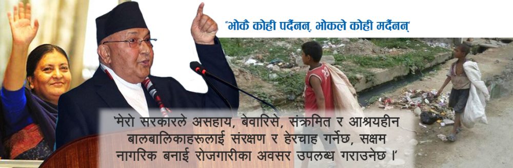 त्यस्तै ०७६–०७७ को नीति तथा कार्यक्रममा उल्लेख गरिएको कुरा पढ्दै राष्ट्रपति विद्यादेवी भण्डारीले भनेकी थिइन्– ‘मेरो सरकारले असहाय, बेवारिसे, संक्रमित र आश्रयहीन बालबालिकाहरुलाई संरक्षण र हेरचाह गर्नेछ, सक्षम नागरिक बनाई रोजगारीका अवसर उपलब्ध गराउनेछ ।’