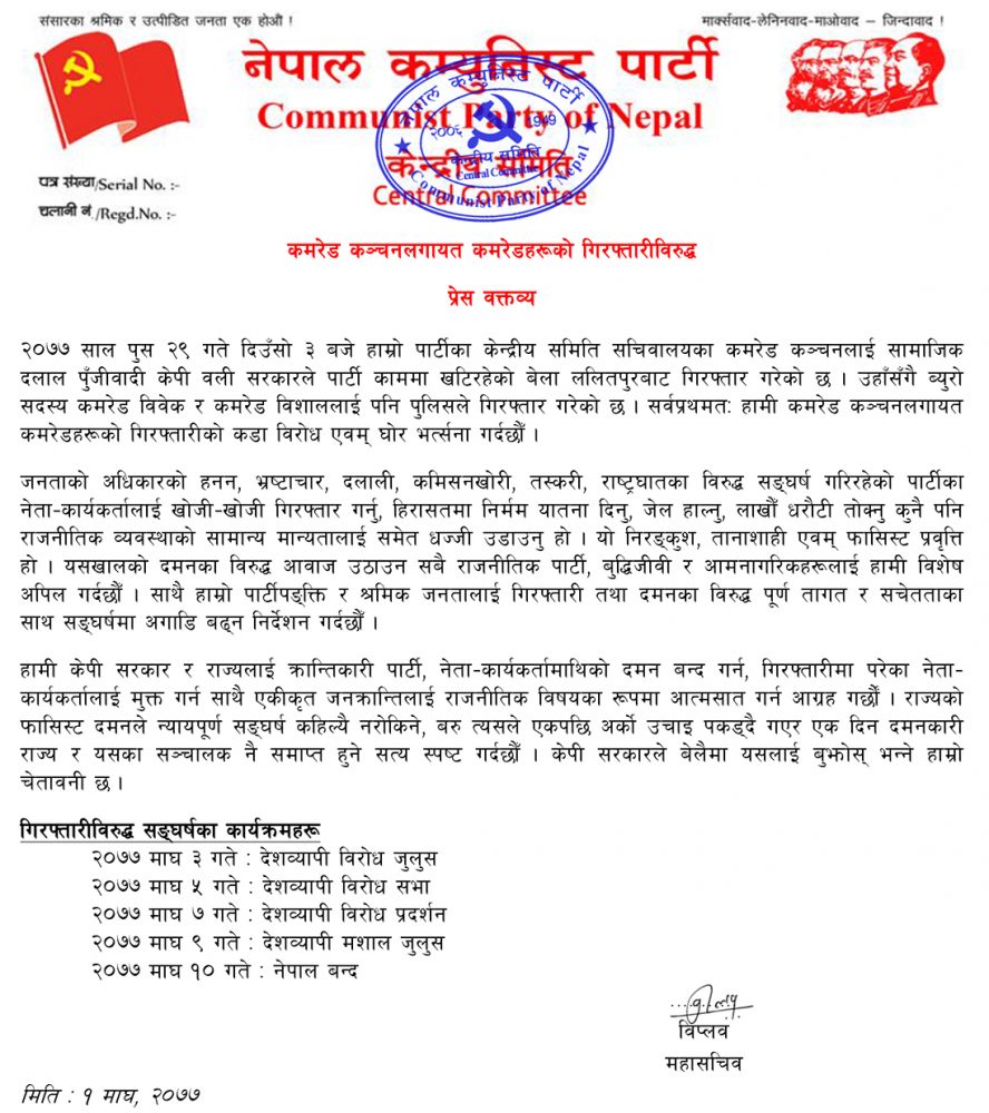 काठमाडौँ । प्रतिबन्धित विप्लव नेतृत्वको नेकपाले आज (शनिबार) नेपाल बन्दको घोषणा गरेको छ। पार्टीका केन्द्रीय सचिवालय सदस्य धर्मेन्द्र बास्तोला कञ्चनको गिरफ्तारी विरुद्ध विप्लव समूहले नेपाल बन्दको घोषणा गरेको हो।