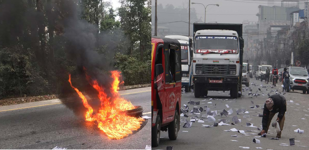 प्रधानमन्त्रीविरुद्ध चितवनमा प्रचण्ड–नेपाल समूहद्वारा टायर बालेर प्रदर्शन