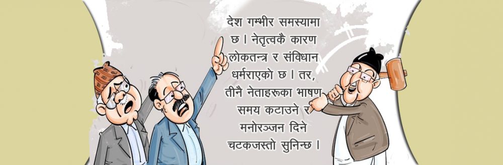 देश गम्भीर समस्यामा छ । नेतृत्वकै कारण लोकतन्त्र र संविधान धर्मराएको छ । तर, तीनै नेताहरुका भाषण समय कटाउने र मनोरञ्जन दिने चटकजस्तो सुनिन्छ ।