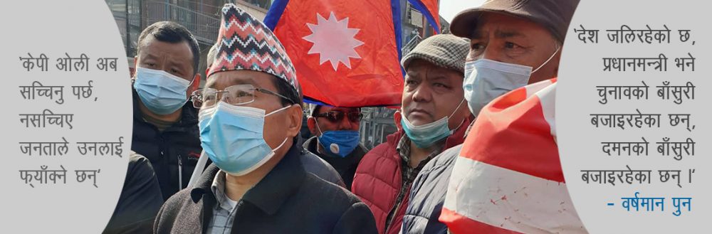नेकपा प्रचण्ड–माधव समूहको आमहड्तालका क्रममा चावहिलमा आएका नेता वर्षमान पुनले भने, ‘नेपाली कांग्रेसदेखि लिएर आम जनता आन्दोलनमा छन्, नागरिक आन्दोलनमा रहेका बेला उनीहरुमाथि दमन गरेर केपी ओलीले ज्यादती गरेका छन् । यो लोकतान्त्रिक शासन हो । देश जलिरहेको छ । उनी भने चुनावको बाँसुरी बजाइरहेका छन्, दमनको बाँसुरी बजाइरहेका छन् ।’