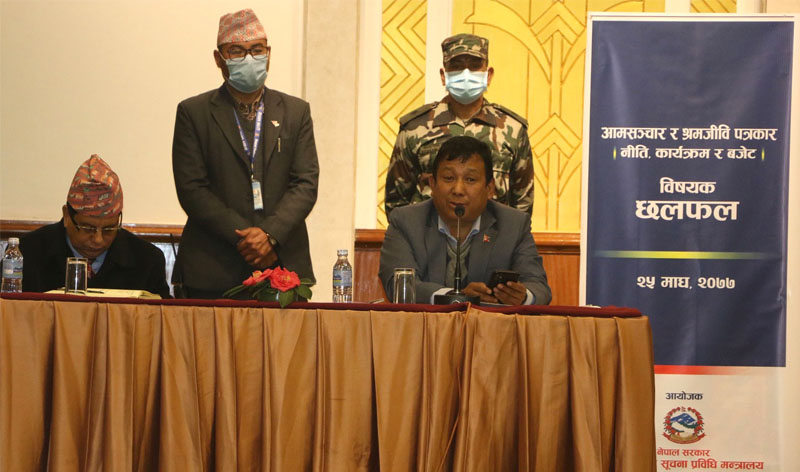 मन्त्रालयद्वारा यहाँ आज आयोजित ‘आमसञ्चार तथा श्रमजीवी पत्रकारः नीति, कार्यक्रम तथा बजेट’ विषयको अन्र्तक्रियामा मन्त्री गुरुङले कोभिड प्रभावित श्रमजीवी पत्रकारलाई राहत प्याकेज ल्याइने घोषणासमेत गरेका छन् ।