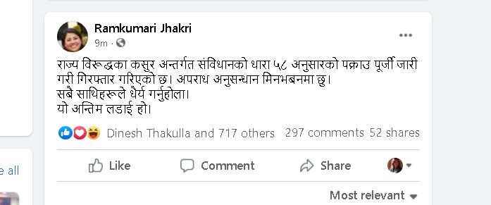 उनले सामाजिक फेसबुकमा लेखेकी छन्– ‘राज्य विरूद्धका कसुर अन्तर्गत संविधानको धारा ५८ अनुसारको पक्राउ पूर्जी जारी गरी गिरफ्तार गरिएको छ। अपराध अनुसन्धान मिनभबनमा छु। सबै साथिहरूले धैर्य गर्नुहोला। यो अन्तिम लडाई हो।’