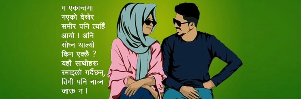 फेरी दियाले प्रश्नको प्रहार गरिन् । अब पालो तपाईको, ल भन्नुस् तपाईको नाम के हो ? समीर । राम्रो रैछ नाम । मनमनै मैले भनिदिए । हामी आ–आफ्नै धुनमा नास्ता गर्न लाग्दै थियौं । तर, जसरी मेरो आँखा उ माथि पर्यो मैले महशुस गरेँ दुवैको आँखा एकै ठाउँमा जुध्दै रैछ । मेरो जुत्ताको लेस फुस्किएको उसले आँखाको इसाराबाटै बतायो । म जुत्ता हेर्न लागे र लेस बाँध्न थाले । निहुँरिदा प्रितमले दिएको लकेट झुण्डियो । लकेट देख्दा मेरो मन र दिमाग मेरो डिम्पल मन पराउने हँसिलो प्रितममा गएर रोकियो ।