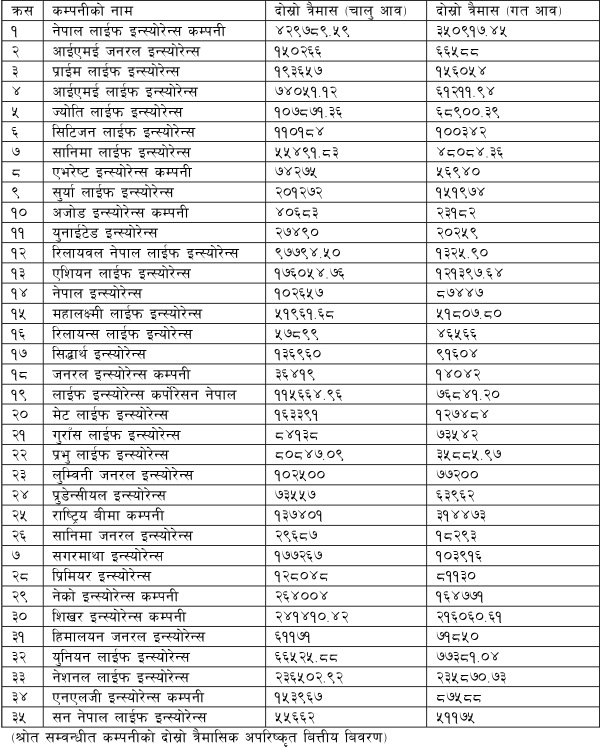 नेपाली बीमा क्षेत्रमा हाल जीवन बीमा तर्फ १९ वटा, निर्जिवन बीमा तर्फ २० वटा र पुर्नबीमा तर्फ एउटा कम्पनीहरुले बीमा कारोवार सञ्चालन गर्दे आएका छन् । ती मध्ये हालसम्म ३५ वटाले चालु आर्थिक बर्षको दोस्रो त्रैमासिक अपरिष्कृत बित्तीय बिवरण सार्वजनिक गरिसकेका छन् । यसरी बित्तीय बिवरण सार्वजनिक गर्ने कम्पनीहरु मध्येमा सबै भन्दा बढी नाफा नेपाल लाईफ इन्स्योरेन्स कम्पनीले कमाएको छ । नेपाली बीमा क्षेत्रमा सबैभन्दा बढी चुक्ता पुँजी भएको बीमा कम्पनीको रुपमा दर्ज भएको नेपाल लाईफ इन्स्योरेन्स कम्पनी खुद मुनाफा आर्जनमा पनि सबै भन्दा अगाडि देखिएको छ । कम्पनीले चालु आर्थिक बर्षको दोस्रो त्रैमासिक अवधिमा ४२ करोड ९७ लाख ८९ हजार पाँच सय ९८ रुपैयाँ खुद मुनाफा आर्जन गरेको छ । गत आवको सोही अवधिमा कम्पनीको यस्तो नाफा ३५ करोड नौ लाख १७ हजार चार सय ५७ रुपैयाँ रहेको छ । हाल चुक्ता पुँजी सात अर्ब १९ करोड ९९ लाख ७० हजार ६ सय ६१ रुपैयाँ रहेको कम्पनीको प्रति सेयर आम्दानी ११ रुपैयाँ ९४ पैसा रहेको छ । यस अवधिमा कम्पनीको प्रतिसेयर नेटवर्थ भने एक सय २२ रुपैयाँ ९५ पैसा रहेको छ ।