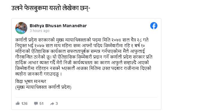कर्णाली प्रदेशका मुख्य न्यायाधिवक्ता मानन्धरले दिए राजीनामा