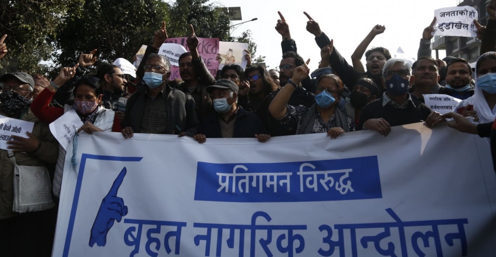 प्रतिनिधिसभा विघटनको विरोधमा बृहत् नागरिक आन्दोलनले शुक्रबार काठमाडौंको टूँडिखेल वरपर मार्च पास गरेको हो । उनीहरुले रत्नपार्क, शंखधर साख्वा पार्कबाट सुरु भएको मार्च भद्रकाली, शहीद गेट हुँदै संकटा मन्दिरमा पुगेर सभामा परिणत भएको छ ।