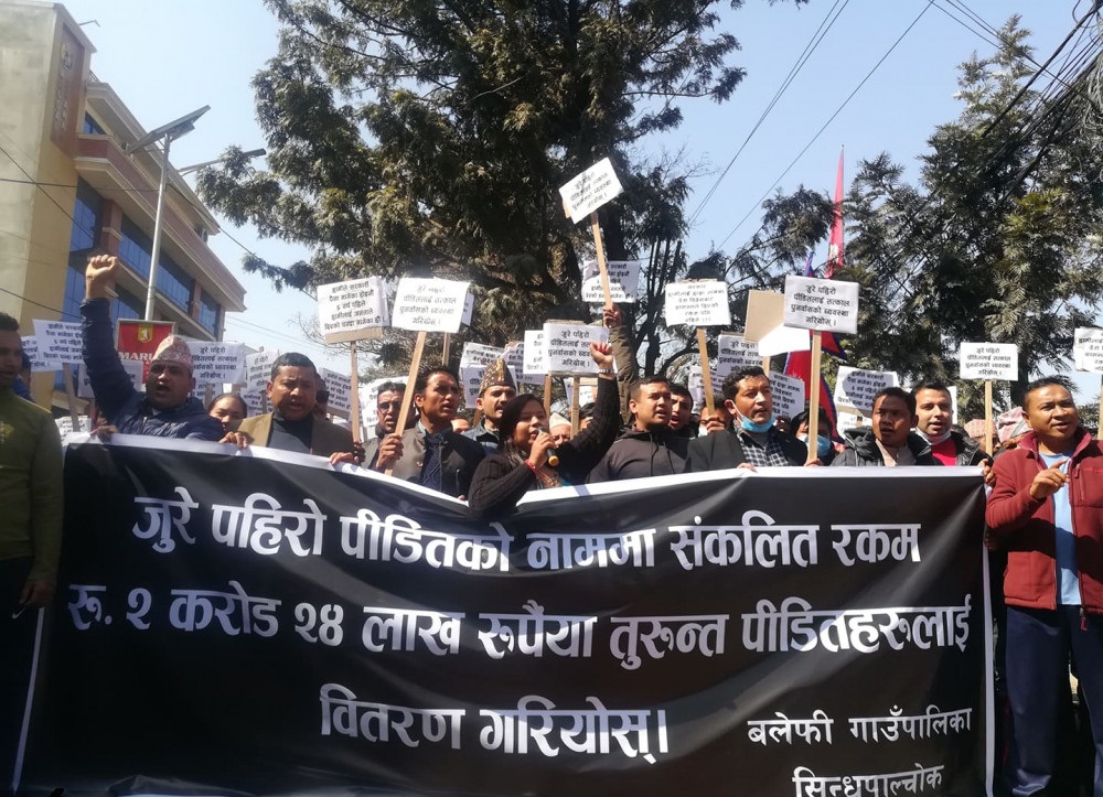 सिन्धुपाल्चोकको जुरे बलेफी गाउँपालिकाबाट आएका पहिरो पीडितहरूले आफूहरुका नाममा संकलित २ करोड २४ लाख रुपैयाँ तुरुन्त वितरण गर्न माग गर्दै प्रदर्शन गरेका हुन् ।