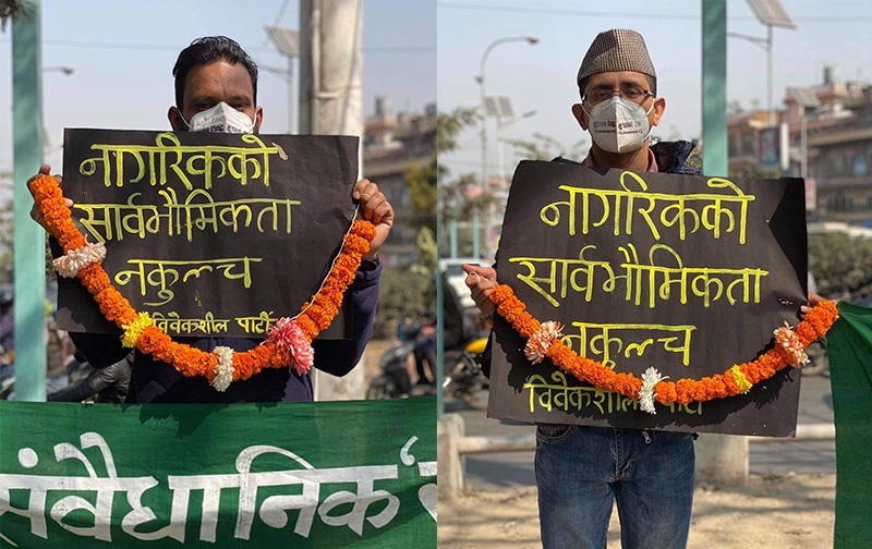 नागरिकहरुको लामो समयदेखिको चाहना र ठूलो त्यागबाट बनेको संविधान समाप्त पार्ने बाटोमा नलाग्न र नागरिकहरुमा निहित सार्वभौमसत्ताको सम्मान गर्न आग्रह गर्दै फूलमाला लिएर प्रदर्शन गरेको विवेकशील पार्टीका नेता लक्ष्मण श्रेष्ठले बताए ।