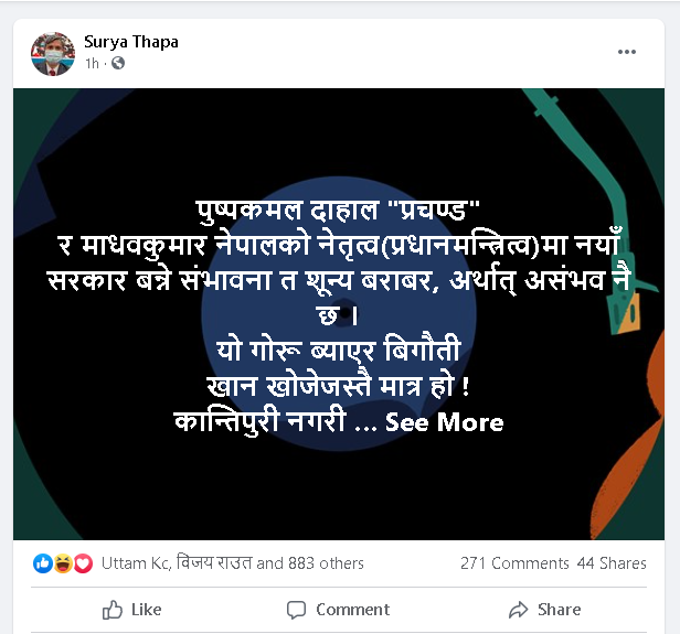 बिहीबार सामाजिक सञ्जाल फेसबुकमा कटाक्ष गर्दै उनले प्रचण्ड–नेपालको नेतृत्वको प्रधानमन्त्रीत्वमा नयाँ सरकार बन्ने सम्भावना असम्भव र शून्य बराबर रहेको टिप्पणी गरेका हुन् ।