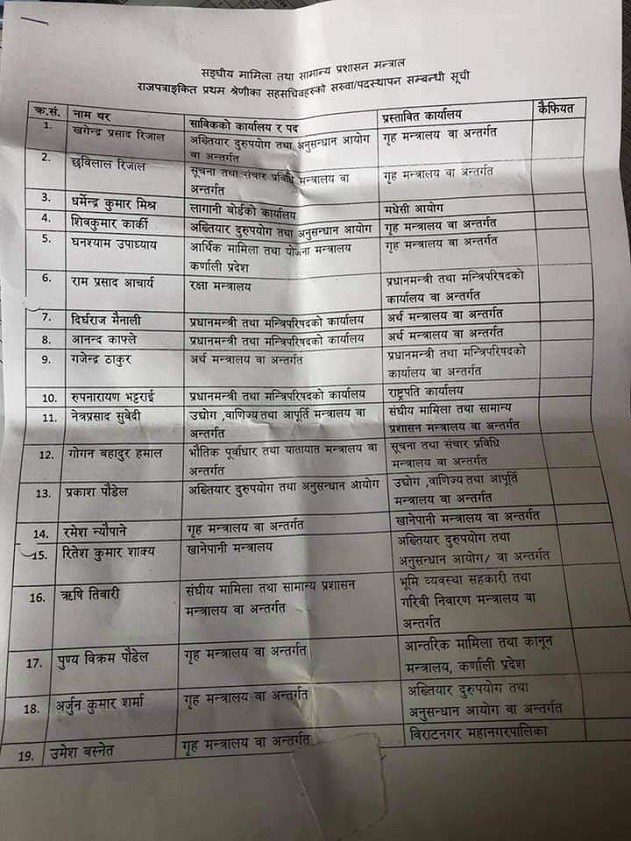 रक्षा मन्त्रालयका सहसचिव राम प्रसाद आचार्यलाई प्रधानमन्त्री तथा मन्त्रिपरिषको कार्यालयमा सरुवा गरिएको छ। राजश्व अनुसन्धान विभागका महानिर्देशक दीर्घ राज मैनालीलाई अर्थ मन्त्रालय, प्रधानमन्त्री तथा मन्त्रिपरिषद कार्यालयका आनन्द काफ्लेलाई अर्थ मन्त्रालय, अर्थ मन्त्रालयको गजेन्द्र ठाकुरलाई प्रधानमन्त्री तथा मन्त्रिपरिषद्को कार्यालयमा सरुवा गरिएको छ।