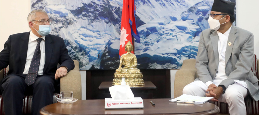 काठमाडौं । राष्ट्रिय सभा अध्यक्ष गणेशप्रसाद तिमिल्सिनासँग नेपालका लागि इजरायलका राजदूत हनान गोडेरले शिष्टाचार भेटघाट गरेकाछन । सिंहदरबारस्थित अध्यक्ष तिमिल्सिनाको कार्यकक्षमा दोस्रो कार्यकालका लागि हालै नियुक्त इजरायली राजदूत गोडेरले तिमिल्सिनासँग सोमबार भेट गरेका हुुन । भेटका क्रममा अध्यक्ष तिमिल्सिनाले कूटनीतिक सम्बन्ध स्थापनाको ६० वर्षसम्म दुई देशबीच सुमधुर र मैत्रीपूर्ण सम्बन्ध रहेको बताए ।