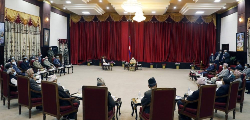 काठमाडौं । राष्ट्रपति विद्यादेवी भण्डारीले आह्वान गरेको सर्वदलीय बैठक सकिएको छ । राष्ट्रपति निवास शीतल निवासमा बसेको सर्वदलीय बैठकमा राष्ट्रपति भण्डारीले आफ्नो बंगलादेश भ्रमणका विषयमा जानकारी गराएकी छिन् ।