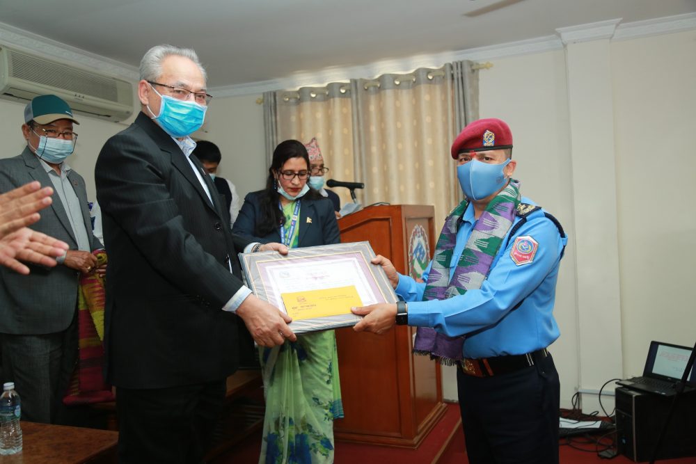 गृह मन्त्रालयमा आज (आइतबार) आयोजित कार्यक्रममा गृहमन्त्री रामबहादुर थापा ‘बादल’ ले प्रहरी महानिरीक्षक शैलेश थापा क्षेत्रीलाई नेपाल प्रहरीले सर्वोत्कृष्ट स्थान हासिल गरेकोमा नगद १० हजार रुपैयाँ पुरस्कारसहित प्रंशासापत्र प्रदान गरेका छन् ।