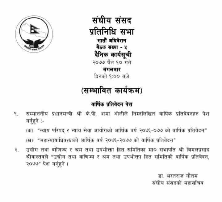त्यसैगरी प्रतिनिधिसभाको उद्योग तथा वाणिज्य र श्रम तथा उपभोक्ता हित समितिका सभापति बिमल प्रसाद श्रीवास्तवले वार्षिक प्रतिवेदन पेश गर्नेछन् ।