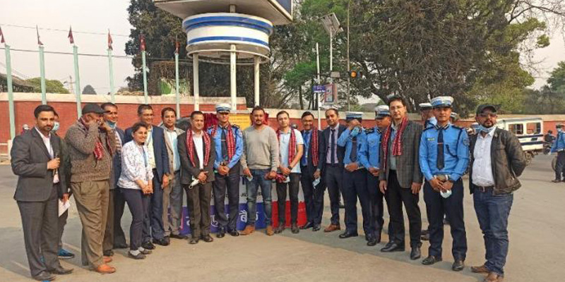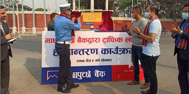 काठमाडौं । माछापुच्छ्रे बैंकले ट्राफिक व्यवस्थालाई सघाउने उद्देश्यले काठमाण्डौँको लैनचौर चोक तथा राष्ट्रपति निवाससँगै रहेको पुलिस एकेडेमी चोकमा ट्राफिक लाईट जडान गरिएको छ । सोमबार एक कार्यक्रमका बिच माछापुच्छ्रे बैंकका संचालक रोशन केसी र विश्व प्रकाश गौतमले उक्त ट्राफिक लाईट महानगरीय ट्राफिक प्रहरी महाशाखाका प्रहरी बरिष्ठ उपरिक्षक जनक भट्टराईलाई हस्तान्तरण गरे । सवारी आवागमनलाई सुरक्षित एंव व्यवस्थित बनाउने विश्वासका साथ बैंकले उक्त स्थानमा ट्राफिक लाईट जडान गरेको हो ।
